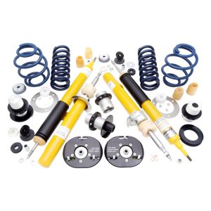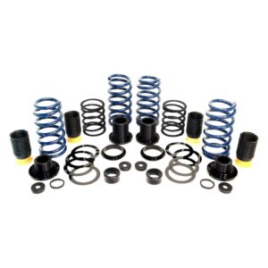 Coil-Over Suspension Kit by Dinan®. For the driver that demands the best out of their vehicle. The Dinan® Adjustable Coil-Over Suspension was bred in the race lab but refined on the street for maximum versatility. No matter the environment, the traction that is bestowed upon the vehicle from the improved suspension will inspire new found confidence when running at higher speeds. Combined with a substantial reduction in body roll as well as reducing dive under breaking and squat under acceleration. Dinan will guarantee you superior handling, performance, and comfort. Dinans design implements threaded collars to allow the user to change the ride height. The end result is a sleek lowered stance that provides improved handling to go along with its stunning visual appearance. The springs combined with progressive bump stops and other components increase travel that allows the car to be lowered. Suspension packers are included to fine tune handling and comfort by changing the clearance of the progressive bump-stops, something no respectable race car is without. Components are machined from 6061-T6 aluminum and black anodized for appearance and corrosion protection.